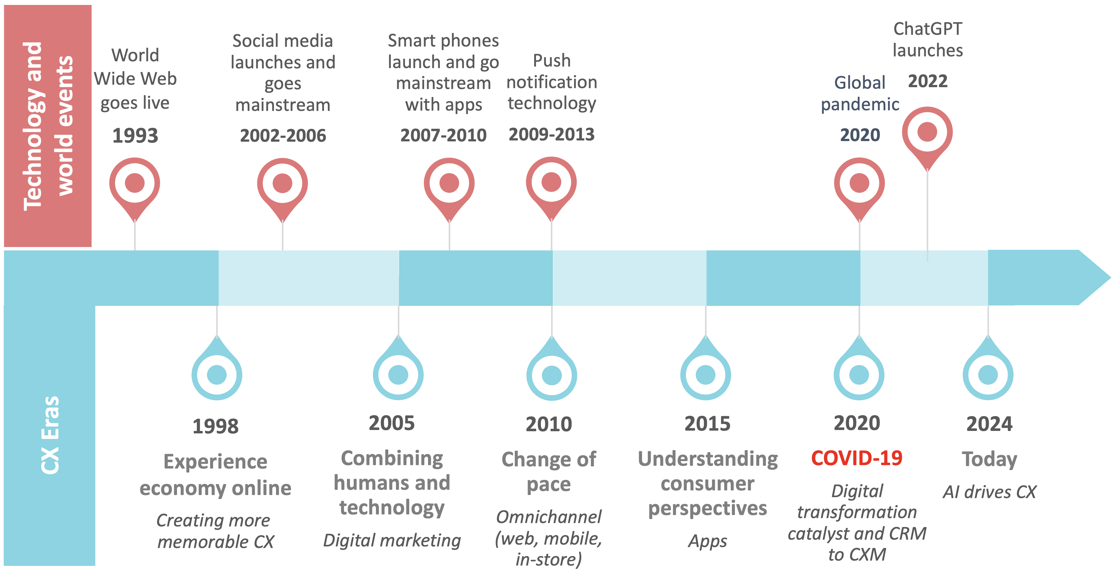 This was the era of digital transformation and the evolution of CRM (Customer Relationship Management) to CXM (Customer Experience Management). What makes it unique from previous eras is that it was caused by a global health event. The pandemic accelerated the digital transformation of companies that had been underway in previous eras.